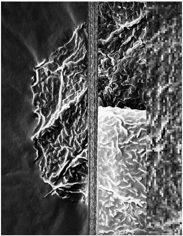 Heartstrings examines the internal and external tensions of the human body by looking at the artist’s own dead skin cells. Naim manipulates the initially accidental glitch that corrupts the image, as it mimics the relationship one has to their own internal body- non- retrievable information. The individual artwork titles in the series – Stare, Choke, Tense, Sweat, Falter, Palpitate- originate from physical manifestations of human emotions. This challenges the dynamic tension of the internal and external body. The concepts of boundary and proportion become questioned, and the dialects of scale become complicated, as the cellular lends itself to vast landscapes. Using the Scanning Electron Microscope, the black and white photographs are taken from scans of Naim’s dead skin cells collected from her fingertips- the point of our body that connects us to the external world through the sense of touch.