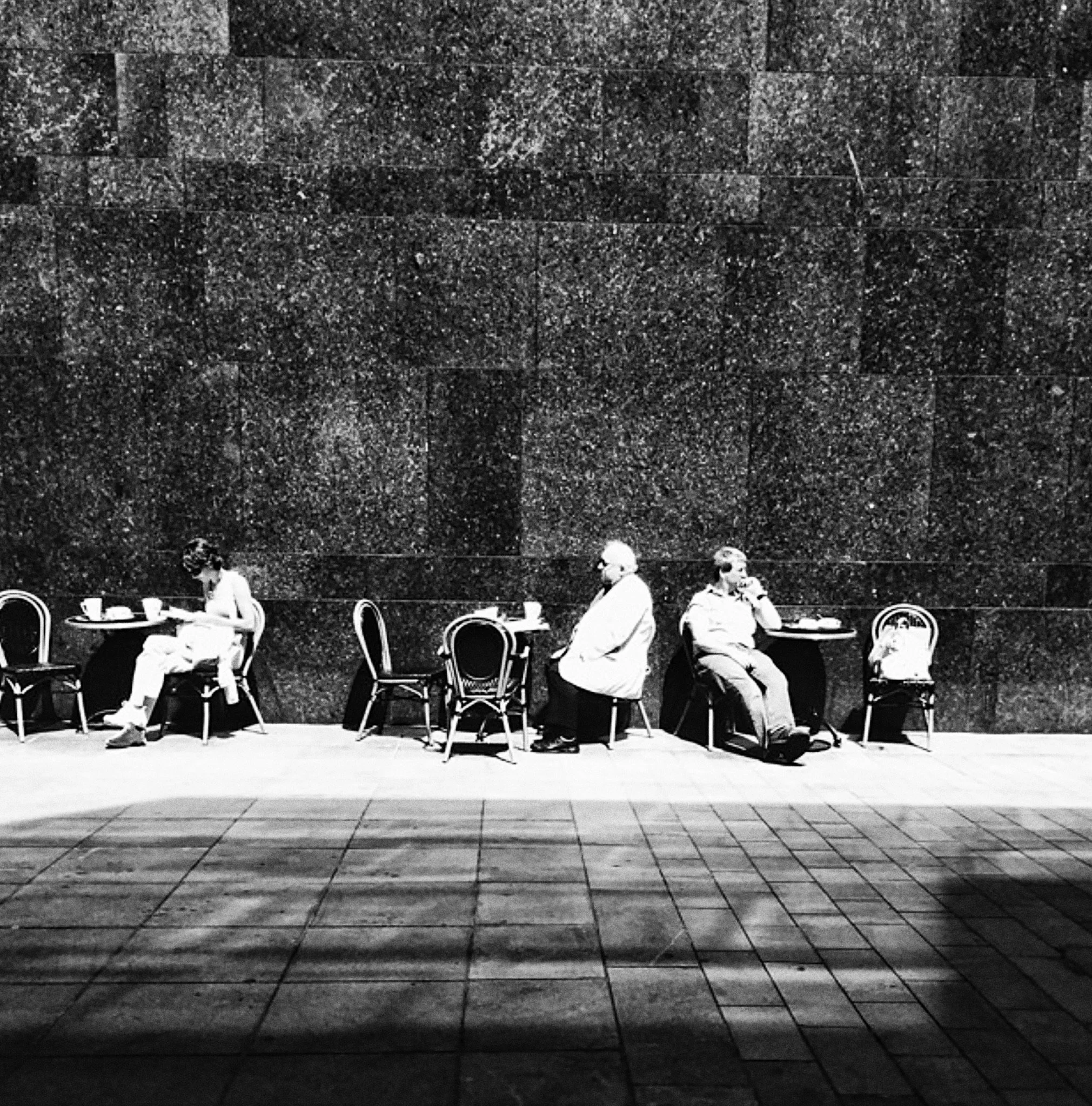 Three coffee tables line an austere wall. A slim line of sun lands at the edge, lighting three single patrons, revealing a trio of silent worlds — of half-tried coffee and unseen crowds of passing thoughts. Territories sharing the same air, nothing else. An empty chair faces each of them, reflecting absence, loneliness, perhaps a hint of something to come; a mirror for the observer, and the one being observed. The artist stands unnoticed across the street, positions this scene within the frame, and in his delicate way, leaves enough space for us to enter.